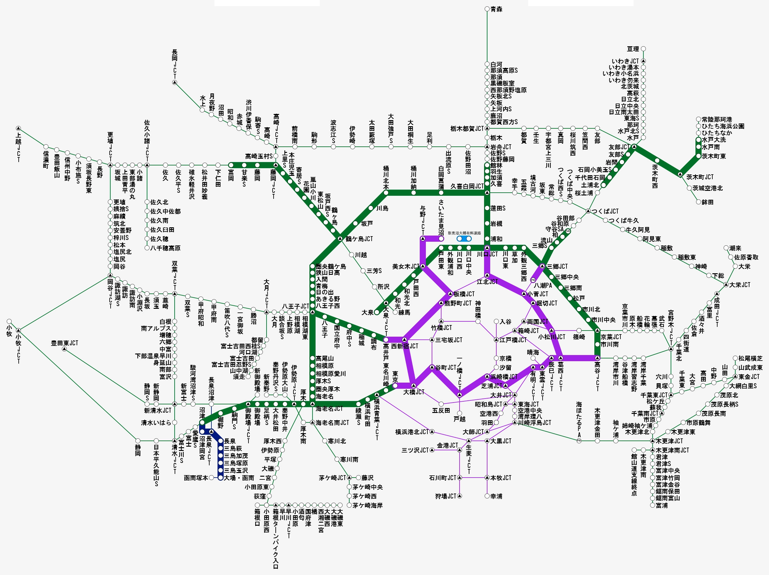 - 一般の高速道路路線は全てのIC・JCTを、首都高速道路は全てのJCTと主要な出入口のみを掲載。